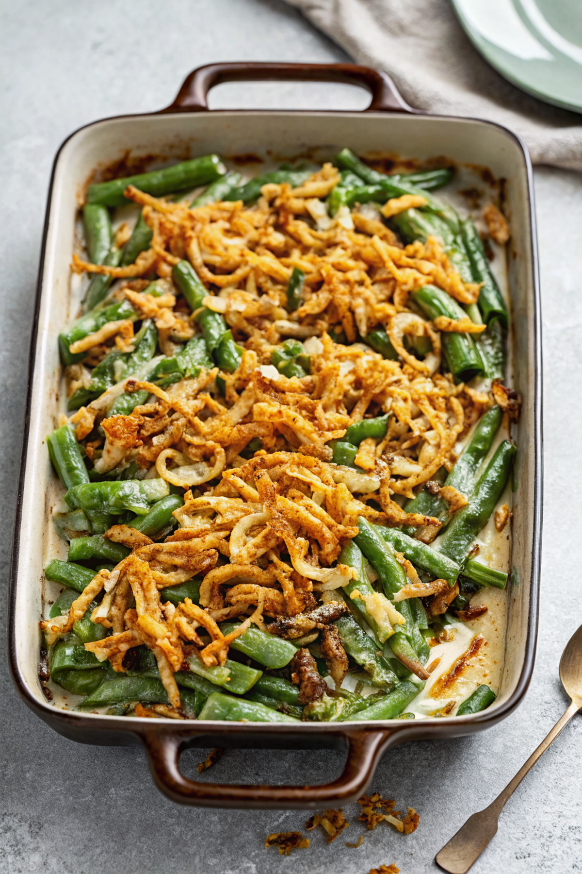 The green beans stay tender-crisp, the sauce is luxuriously smooth, and the golden French fried onions on top add the perfect crunch. Each spoonful is the perfect balance of creamy and crispy — a homemade upgrade to the timeless dish everyone loves.