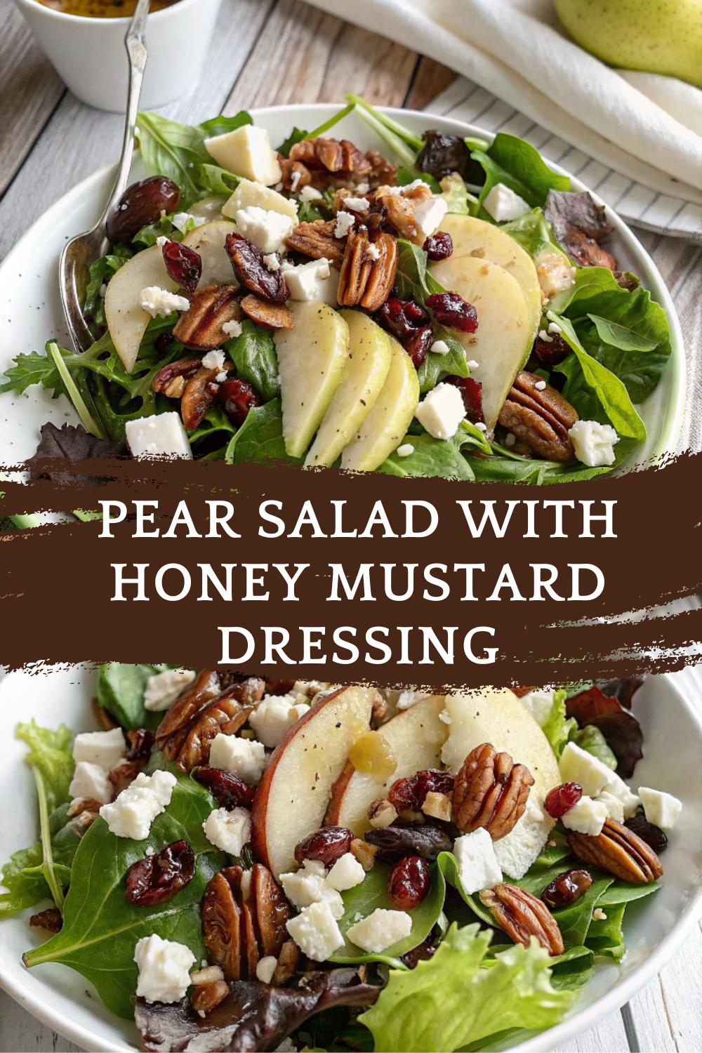 You can prep the pears, toast the nuts, and make the dressing a day ahead. Assemble everything just before serving for the freshest taste. 🥄 Variations This Pear Salad with Honey Mustard Dressing is wonderfully adaptable — here are some tasty variations to try: Add Protein: Top with grilled chicken, turkey breast, or chickpeas for a complete meal. Cheese Swap: Try goat cheese or blue cheese instead of feta for a stronger, creamier flavor. Nutty Variation: Substitute pecans with walnuts, almonds, or hazelnuts. Fruit Mix: Add apple slices, orange segments, or pomegranate seeds for extra color and flavor. Vegan Version: Omit feta and use maple syrup instead of honey for a plant-based dressing. Greens Variety: Use a mix of baby spinach and arugula for a peppery balance. Creamy Dressing: Blend in a tablespoon of Greek yogurt for a richer texture. Autumn Twist: Add roasted butternut squash cubes or sweet potatoes for warmth and depth. Crunch Boost: Sprinkle pumpkin seeds or toasted sunflower seeds before serving. ❓ 10 FAQs 1. What type of pear is best for this salad?